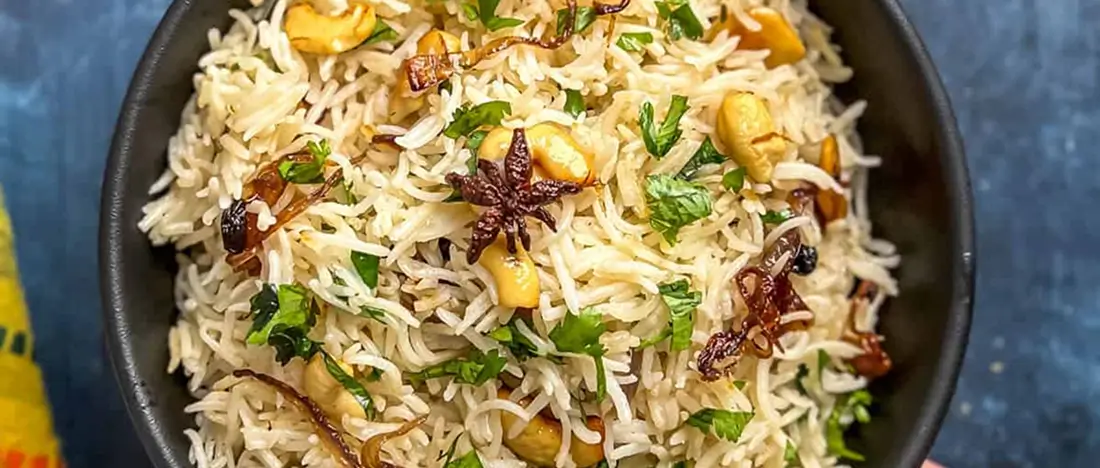 For this, you need to cook onions, ginger, garlic, and tomatoes with spices like turmeric, chili powder, and garam masala. Mix the masala with cooked rice and garnish with coriander.